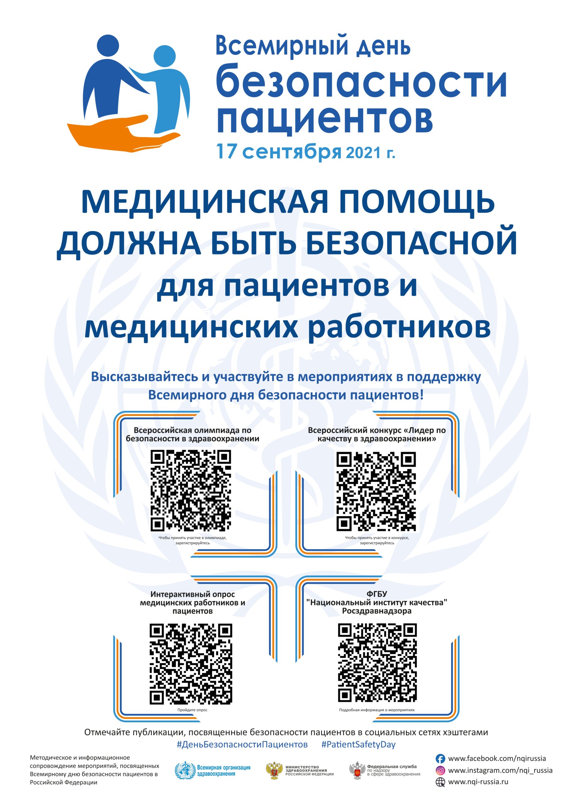 17 сентября 2021 г. Минздравом России совместно с Росздравнадзором и при взаимодействии с представительством ВОЗ в России запланированы мероприятия, посвященные Всемирному дню безопасности пациентов. В 2021 г. для Всемирного дня безопасности пациентов выбрана тема «Безопасность при оказании помощи матерям и новорожденным» ввиду высокого бремени риска и вреда, которому подвержены женщины и новорожденные в связи с небезопасным оказанием помощи при родах. Эта проблема усугубилась в условиях пандемии COVID-19, которая привела к перебоям в предоставлении базовой медицинской помощи вследствие прерывания цепочек снабжения, отсутствия у женщин возможности получать необходимую медицинскую помощь и нехватки квалифицированных специалистов здравоохранения.